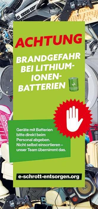 Allgemeiner Infoflyer zur Brandgefahr bei Lithium-Ionen-Batterien – deutschsprachig, Freiform, beidseitig bedruckt.